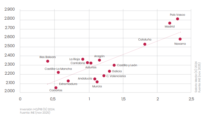 El análisis territorial, apoyado en la herramienta KAILA y sus más de 65 fuentes de datos públicas, elimina el prejuicio de que solo las regiones más pobladas tiran del carro de la modernización. Navarra, con un 2,34%, y País Vasco, con un 2,30%, lideran la intensidad de inversión tecnológica nacional, adelantando por la derecha a las maquinarias de Madrid y Cataluña.