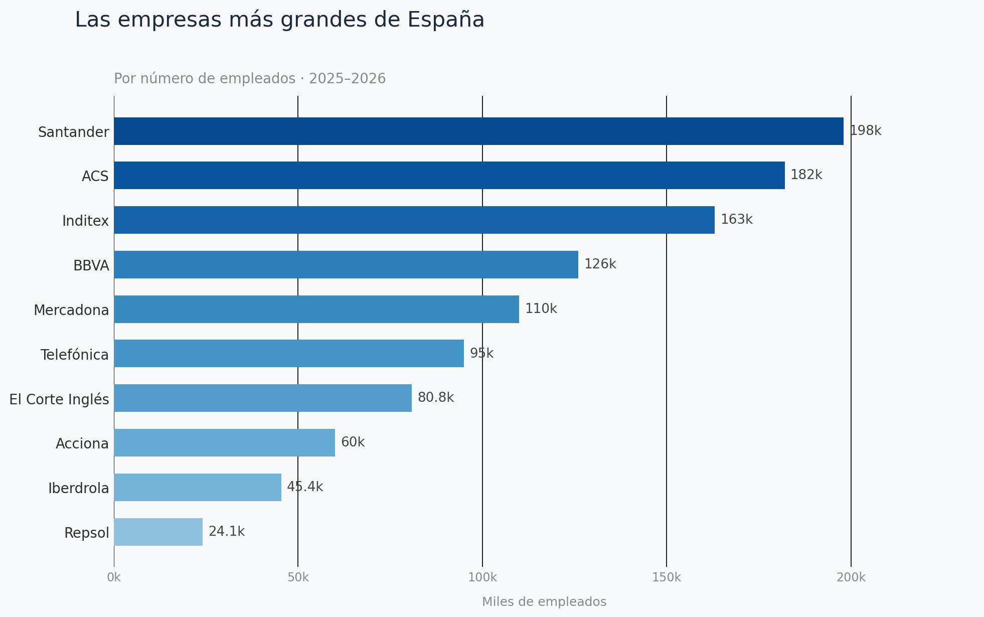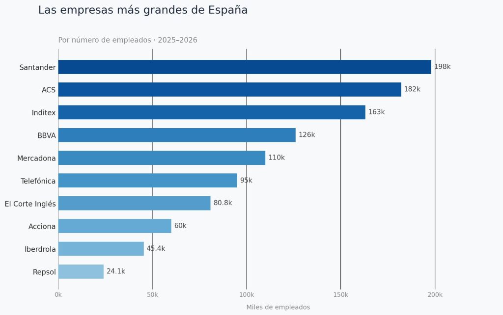 Por un lado, el Banco Santander, que aunque reparte su fuerza laboral por todo el mundo, es un gran empleador en España con 105.700 empleados a finales de 2025 (y más de 200.000 en todo el mundo). Y por otro, Iberdrola, que en 2025 lideró las ganancias reales del país batiendo su propio récord con un beneficio neto de 6.285 millones de euros, superando incluso a Inditex.