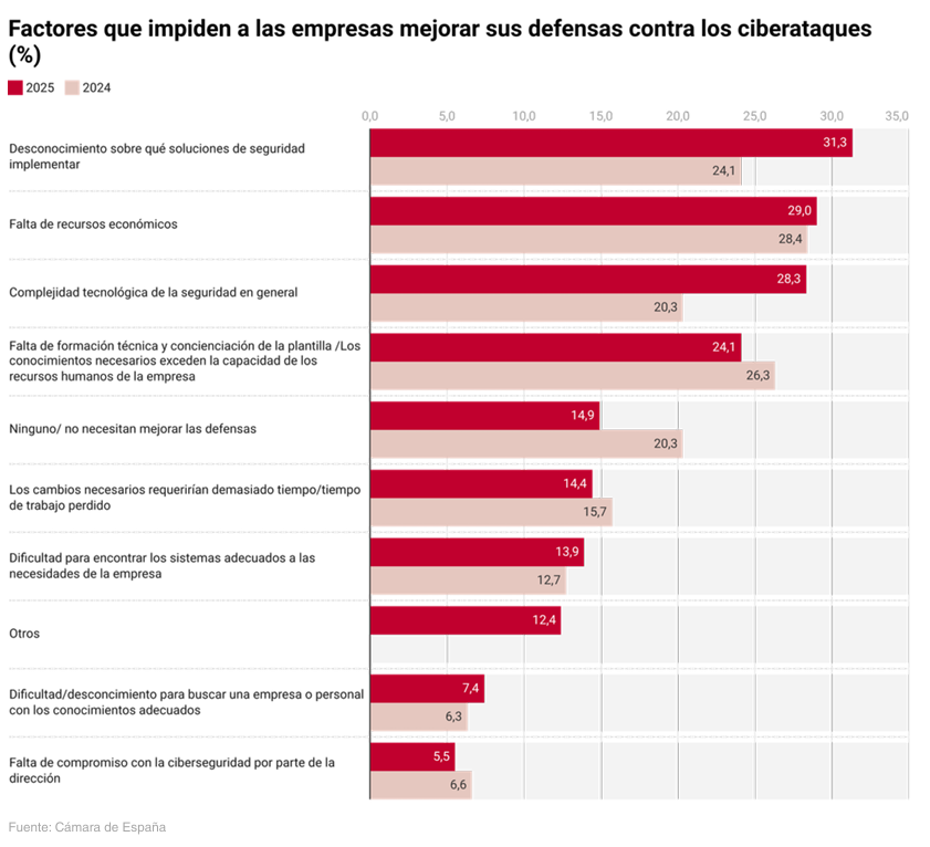 Datos como estos no explican por qué solo una de cada cuatro empresas prevé aumentar su presupuesto de ciberseguridad en los próximos 12 meses, aunque en grandes compañías esa intención sube al 52,9%. Ahora bien, no siempre el desinterés es lo que pone frenos a la inversión en ciberseguridad. También pesa el desconocimiento sobre qué soluciones aplicar (31,3%), la complejidad tecnológica (28,3%) y las limitaciones presupuestarias (29%).