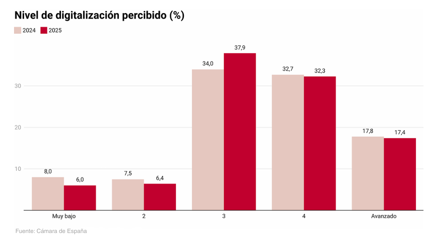 Según el Observatorio de Competitividad Empresarial de la Cámara de Comercio de España, el 87,6% de las empresas nacionales percibe su nivel de digitalización como intermedio o avanzado. Sin embargo, solo el 42,9% dice contar con una estrategia de ciberseguridad. España se cree digital, pero no tiene medidas para protegerse en el mismo entorno que cree dominar.