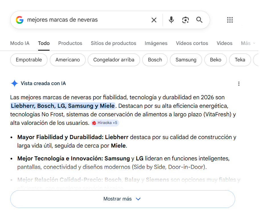 En esta búsqueda, que es de tipo comercial, es decir, tiene una intención de compra directa, un resumen generado por Gemini no es suficiente: la IA no puede enviarle una nevera a casa. El usuario necesita ver modelos, comparar precios reales, comprobar el stock y hacer el pedido en un ecommerce. Por lo tanto, seguirán apareciendo las tiendas online para que el usuario elija y compre.