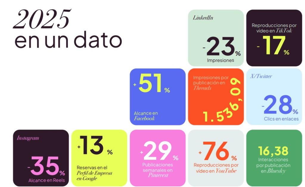 El dato más sorprendente llega de un viejo conocido: Facebook. Lejos de estar «muerta», la plataforma de Meta ha resurgido con fuerza gracias al vídeo. El alcance promedio en Facebook ha crecido un 51%, impulsado casi exclusivamente por este formato.