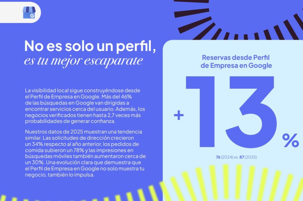 Por otro lado, el Perfil de Empresa en Google (antes Google My Business) se consolida como el escaparate digital definitivo para el comercio local. Las impresiones han crecido y, lo más importante, las acciones de compra también: los pedidos de comida a través de este perfil aumentaron un 78%.