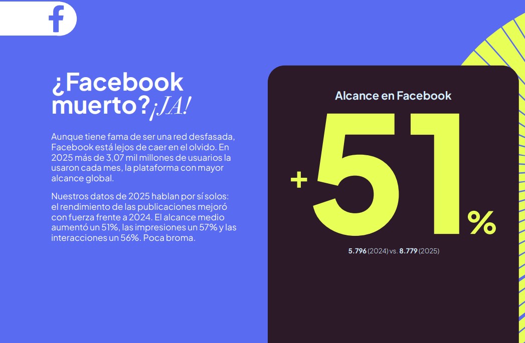 Contrario a la percepción general, Facebook experimentó un crecimiento improtante en 2025: +51% en alcance, +57% en impresiones y +56% en interacciones. El video fue el formato más exitoso, con un aumento del 71% en publicaciones respecto al año anterior.