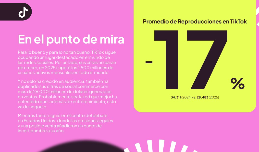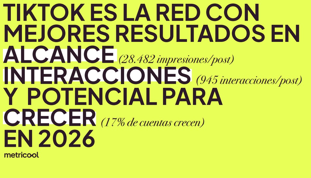 A pesar de una ligera caída en sus métricas respecto a 2024, TikTok sigue siendo la red con mejores resultados en impresiones (28.482 por publicación) e interacciones (945 por publicación). Además, es la plataforma con mayor potencial de crecimiento: un 17% de las cuentas analizadas crecieron en 2025.