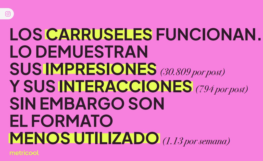 Instagram superó los 3.000 millones de usuarios activos, pero el aumento de cuentas y publicaciones ha generado una **saturación visible**. El alcance de los posts cayó un 31% y el de los Reels un 35%. Sin embargo, formatos como los carruseles demostraron un rendimiento excepcional (30.809 impresiones y 794 interacciones por publicación), aunque sean los menos utilizados.