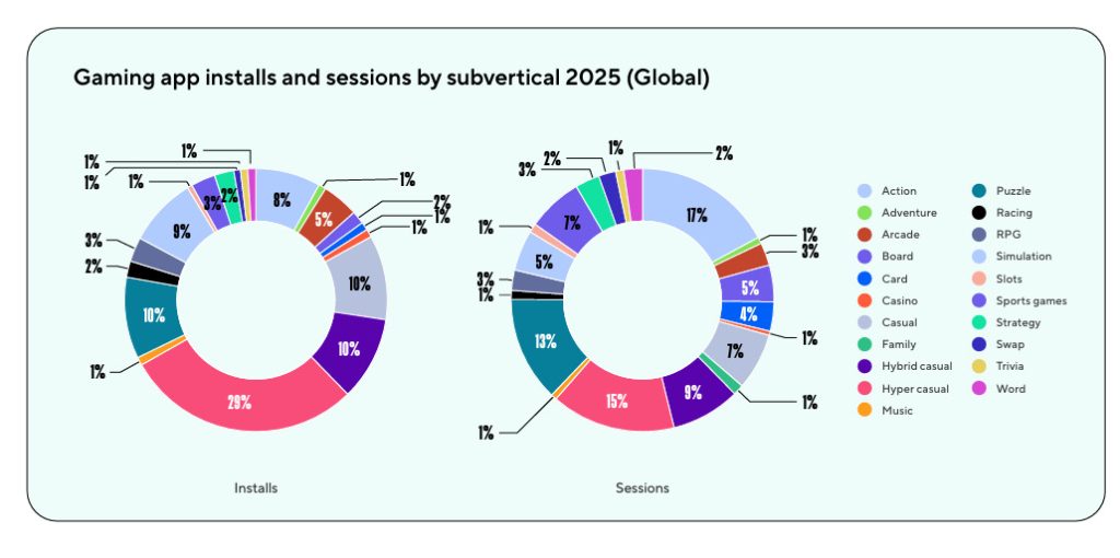 Los juegos hyper-casual, que siempre han buscado millones de descargas rápidas, crecieron mucho más en sesiones (un 31%) que en instalaciones (solo un 4%). Es decir, la gente no está descargando más, pero sí está jugando más con lo que ya tiene. Por eso el informe indica que el futuro está en la retención y en exprimir mejor a cada usuario. El objetivo es que se queden, vuelvan y gasten o vean anuncios durante más tiempo (lo que en gaming se trabaja con actualizaciones constantes y eventos o live-ops).