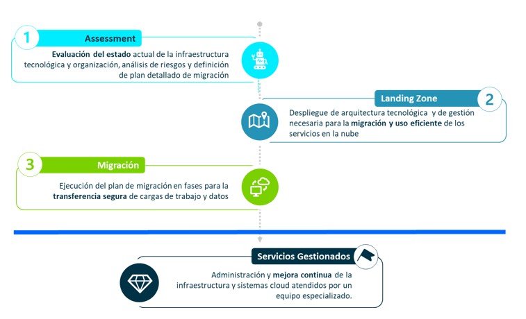 Entre las actividades están el despliegue y configuración de la infraestructura base en la nube, la implementación de políticas de seguridad y control de acceso, la integración con otros servicios cloud (backup, monitorización, seguridad) y el establecimiento de un sistema de comunicaciones y conexión híbrida adecuada para la migración de cargas de trabajo y datos.