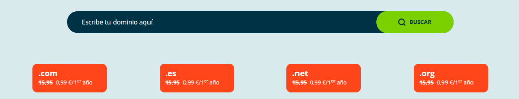 Los dominios .com, .es, .net y .org tienen un precio de registro de 0,99 € el primer año para nuevos clientes. Es una forma de facilitar el primer paso: que el precio no sea nunca un obstáculo para arrancar tu proyecto online.